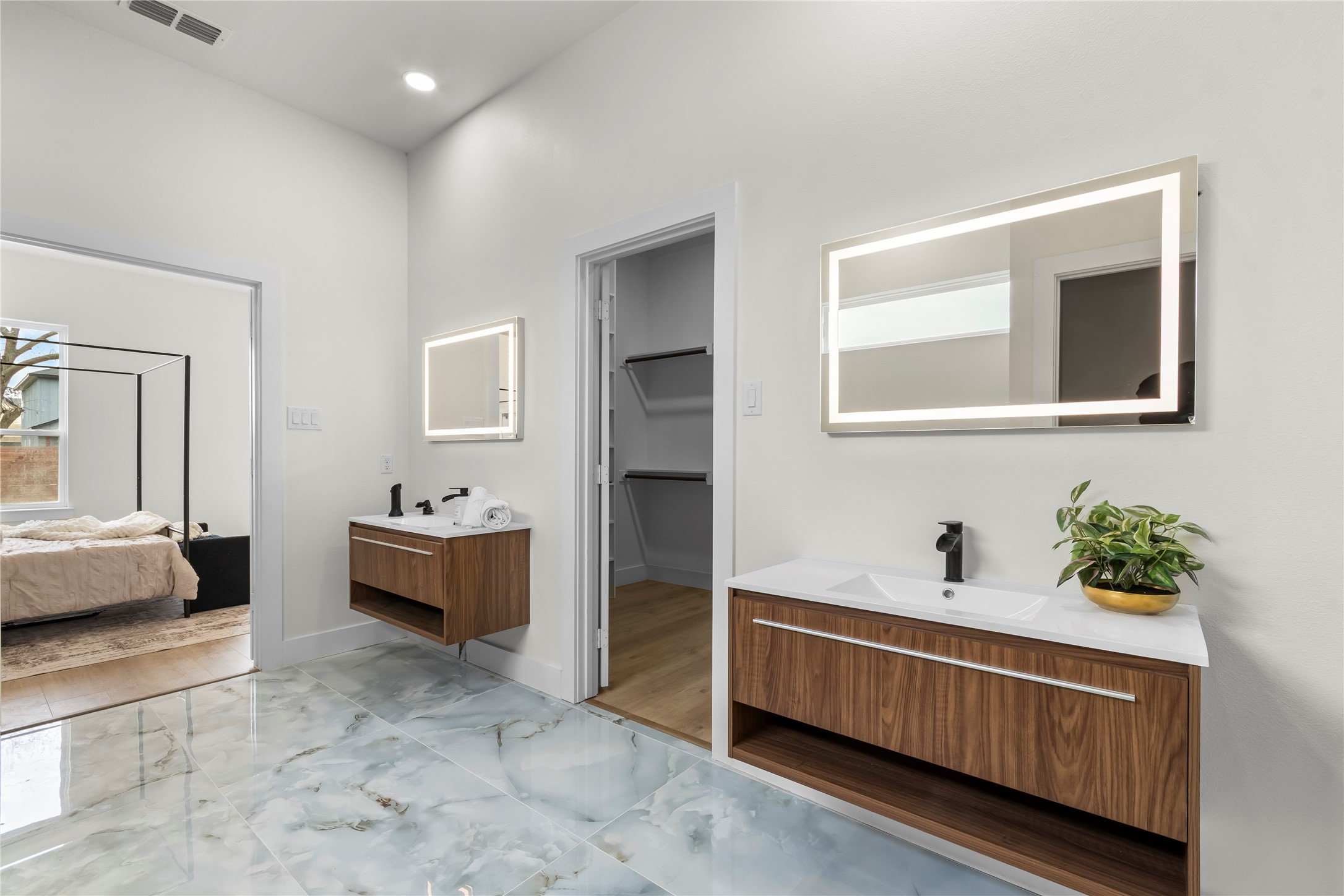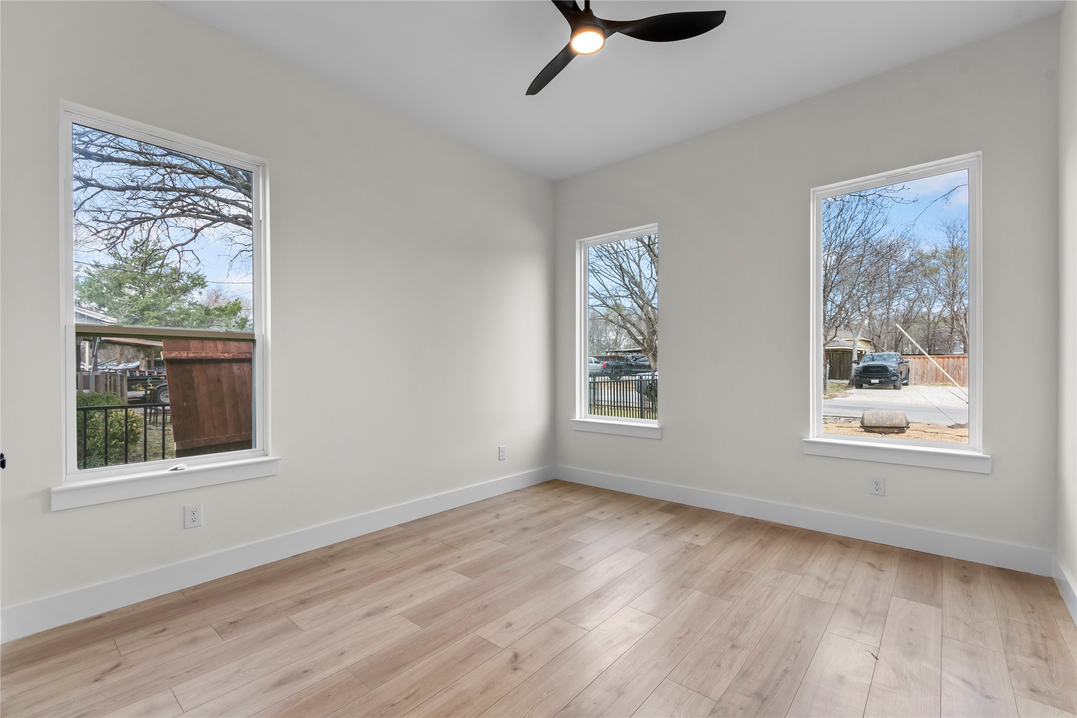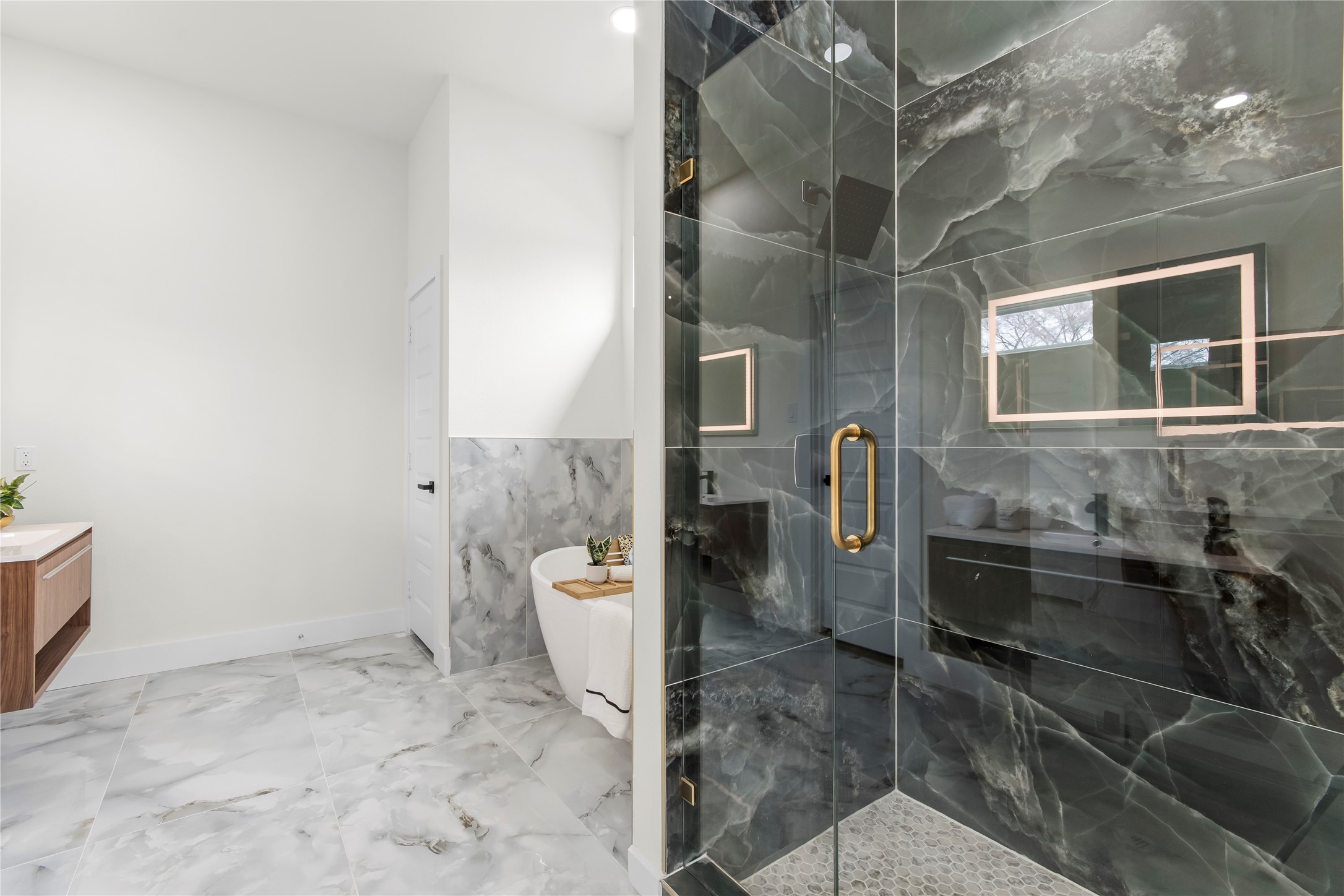 这座令人惊叹的新建建筑,提供三间卧室和三间全套浴室,整体采用现代建筑和设计师风格的装饰。这座设计深思熟虑的住宅采用开放式平面布局、高耸的天花板和充足的自然采光。宽敞的客厅展示了壮观的落地壁炉和俯瞰后院的大窗户。主厨厨房配备了瀑布石英台面、定制橱柜、设计师五金、不锈钢电器、电炉、排风罩和带座椅的大型岛台。步入式储藏室和充足的储藏空间。 主套房内设有水疗风格浴室,配有双梳妆台、超大淋浴间和宽敞的衣橱空间。次卧面积适中,每个卧室均配有全套浴室,非常适合客人或多代同堂居住。现代外观,深色外墙设计醒目,木质装饰,带顶入口,双车库,宽敞庭院。达拉斯地理位置便利,方便通达主要高速公路、购物和餐饮。