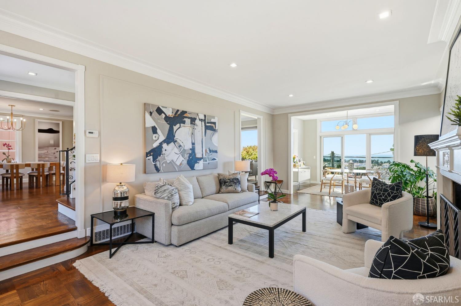 这处位于金门高地的卓越物业拥有全景太平洋景观,拥有罕见的空间、隐私和灵活性,拥有约6,246平方英尺的双人地块,是旧金山的罕见建筑。街道更安静,天空开阔,社区氛围浓厚。住宅跨越三层精心设计的层级,拥有5间卧室和4.5间浴室,空间分离度极佳,同时保持日常生活的理想状态。主层起居区通向一个美丽的海景露台,非常适合早晨咖啡、家庭聚餐和日落聚会。主套房拥有俯瞰水面的私人甲板,营造出宁静的休憩空间。户外生活真正让这个家与众不同。宽敞的前院、宽敞的后院和额外的娱乐甲板为孩子们提供了玩耍空间,宠物可以自由活动,并能舒适地接待20+宾客,这在这座城市是极具奢华的奢侈。全面升级的下层增加了极大的多功能性,设有两间卧室、带套间浴室和家庭/影音室。该空间既有内部通道,也有独立侧门,非常适合大家庭、互惠生或保姆宿舍,或家庭办公室。其他亮点包括后部的双车库。地理位置优越,距离西门户、加州大学旧金山分校帕纳苏斯分校和诺伊谷仅几分钟车程,方便前往市中心、硅谷和旧金山国际机场。金门高地因其附近顶级学校、丰富的公园和宠物友好绿地,以及宁静、友好且紧密的社区氛围而备受喜爱。它常被认为是旧金山最隐秘的秘密之一,提供壮观的视野,且交通拥堵更少。这是一个难得的机会,开启您新篇章,打造一个为家庭生活、娱乐和持久享受而设计的家。